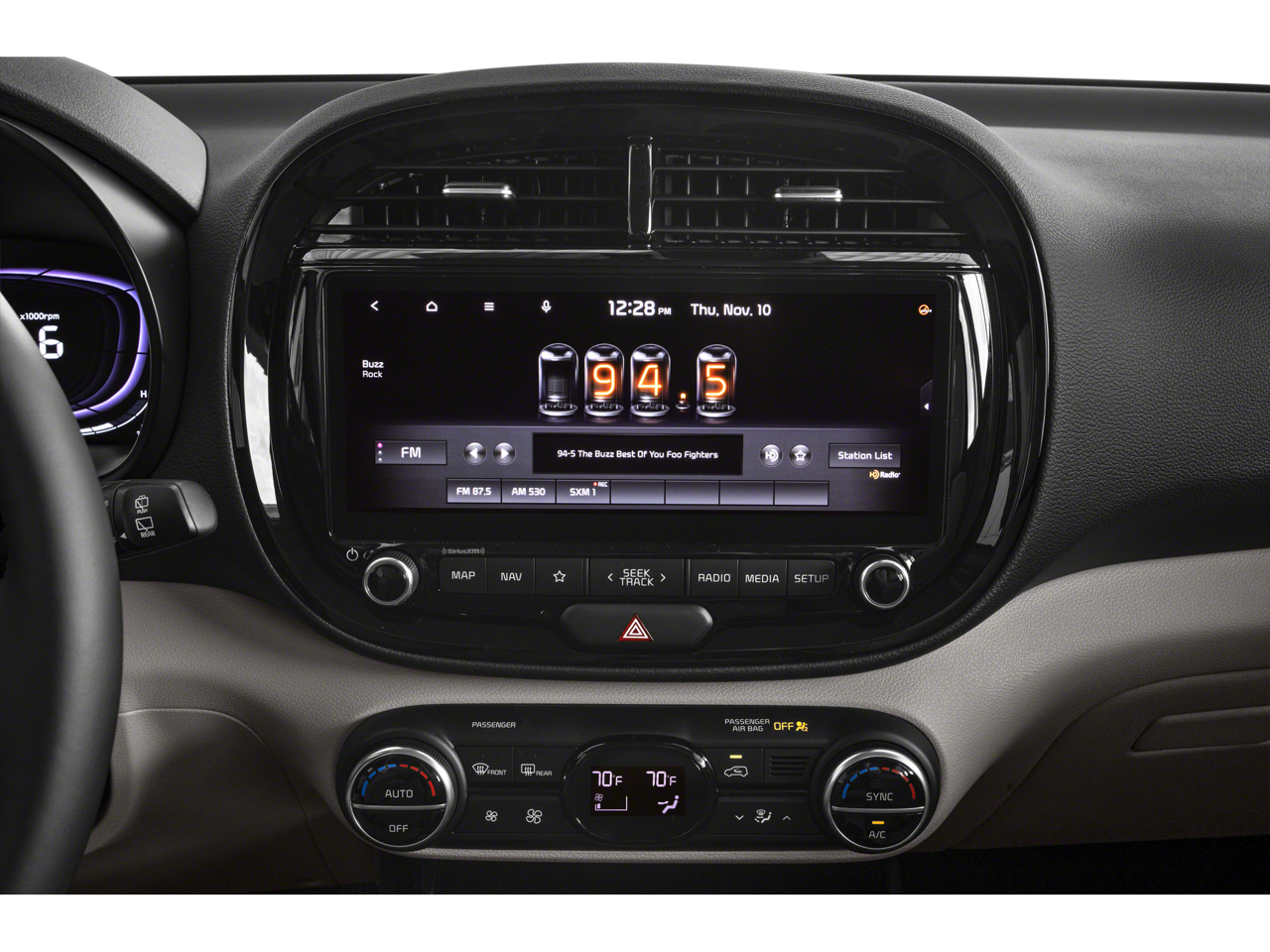 - Radio: AM/FM/MP3/HD Audio System -inc: UVO link, navigation, SiriusXM, 10.25" color touch screen, 6 speakers, support for Android Auto and Apple CarPlay, USB input, audio remote control, Bluetooth® hands-free w/voice recognition and black shark fine type antenna